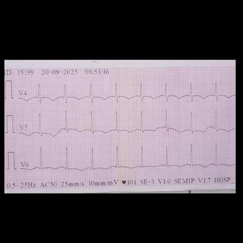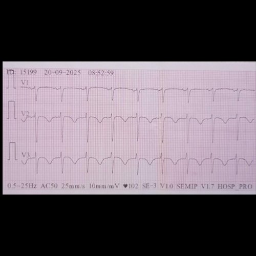Electrocardiograma 12 derivaciones (Dia 31): Ritmo sinusal, FC: 107 lpm, PR: 0.12; QRS: 0.08; QTc: 0.534; AQRS: 0° T negativas de ramas simétricas en cara anterior extensa.