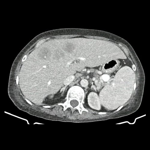 Por presentar persistencia de dolor abdominal inespecífico, se solicita tomografía con contraste la cual informa hepatomegalia concordante con palpación abdominal (5 traveses de dedo por debajo del reborde costal), aumento de tamaño de lesión hepática previa y nuevas lesiones asociadas. En la tomografía de tórax se visualiza la presencia de nuevas imágenes nodulares sólidas, irregulares y heterogéneas distribuidas en ambos campos pulmonares.