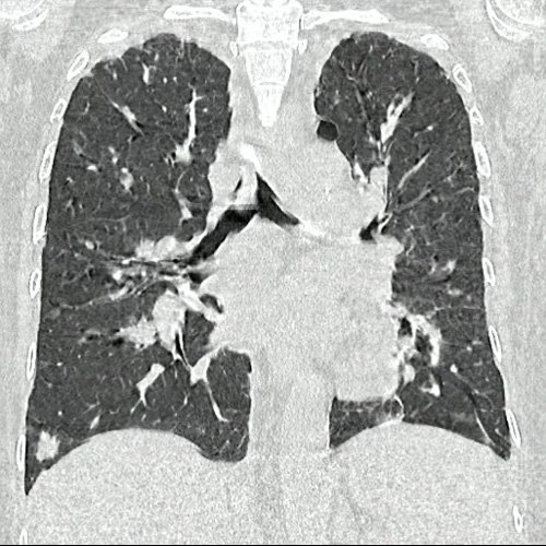 TAC de tórax sin contraste - informe preeliminar (Dia 31): Estudio artefactado por movimientos respiratorios de la paciente. Se observan múltiples lesiones nodulares sólidas, irregulares, heterogéneas, que se extienden por ambos campos pulmonares a predominio derecho, de manera periférica y subpleurales, asociadas a vidrio esmerilado, destacándose la de mayor tamaño en segmento lingular inferior que mide 12 mm x 16mm. Hallazgos que podrían corresponder en primera instancia a proceso inflamatorio infeccioso sin poder descartar secundarismo. Se sugiere control evolutivo. Hallazgos no visualizados en Tc del día 05-08-2025, si se observan en TC del día 24-09-2025. Bulla subpleural paramediastinal, de 14mm, en segmento posterior del LSI. Leve derrame pleural, en esta ocasión, bilateral, de mayor jerarquía a derecha. Múltiples estructuras ganglionares pre y lateroaórticas, axilares bilaterales aumentada en número y de tamaño, de rango no megálico.Laminar derrame pericárdico.